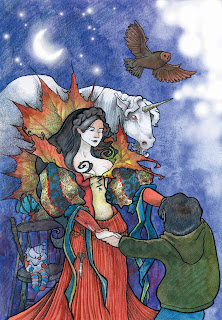 O filme no qual me inspirei para essa imagem é "O Cavaleiro Sem Cabeça", versão do diretor Tom Burton, onde ele cria numa linda cena uma suposta memória de infância de Ichabod Crane com sua mãe feiticeira. Quis trazer para o livro de Luiz a magia desta cena.